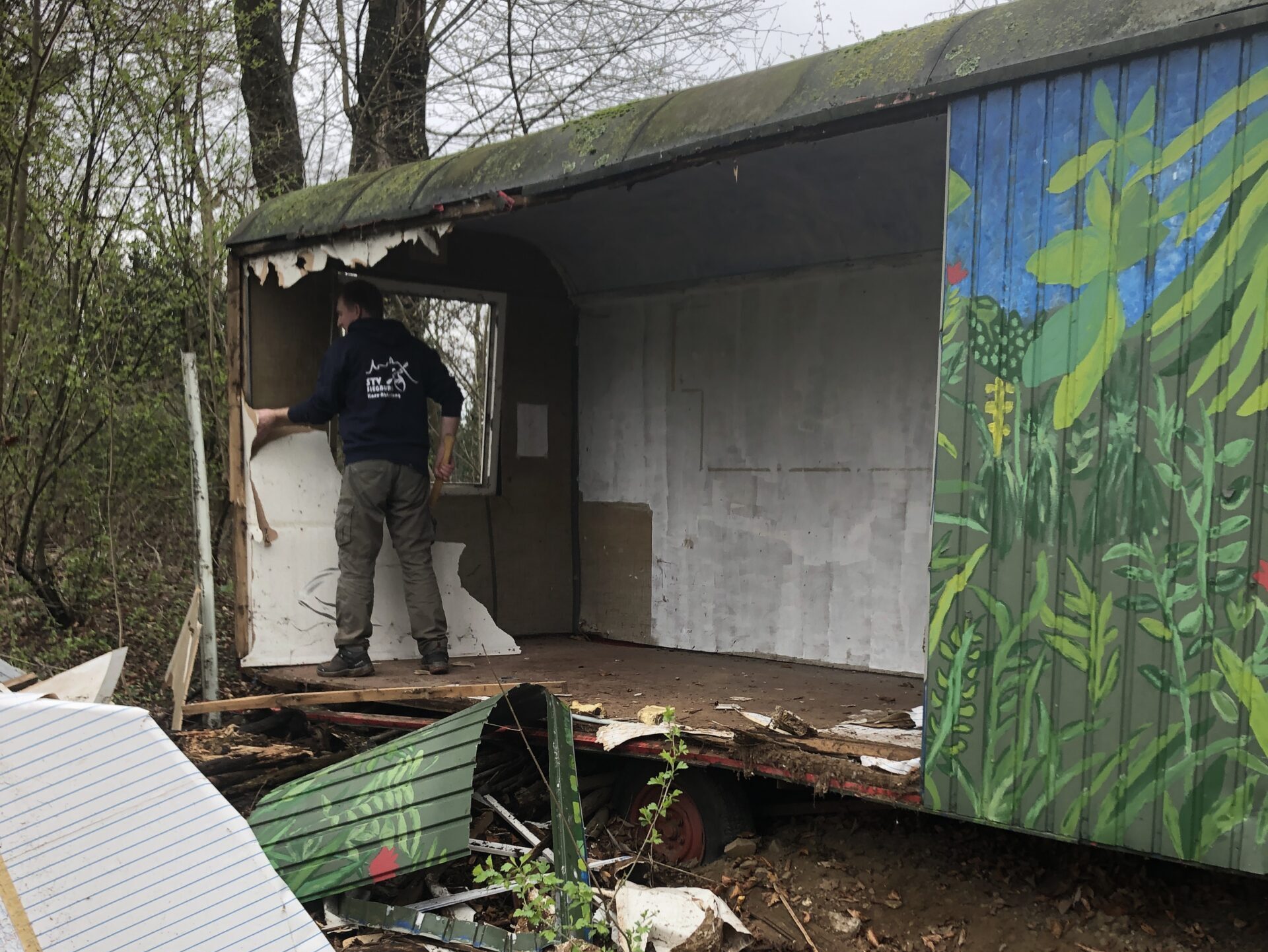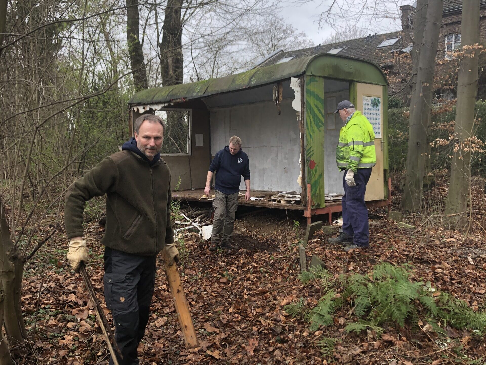 Mit einer kleinen Stärkung zwischendurch wurde viel geschafft. Zu guter Letzt ging es dem „alten“ Bauwagen, das Jugenddomizil früherer Zeiten, an den Kragen. Seit langem unbenutzt, wird er nun Stück für Stück kleiner gemacht.